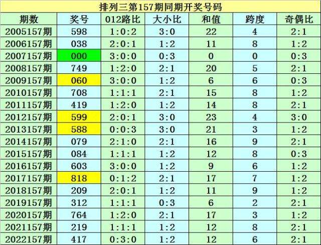 本期为排列三第2023157期开奖,开奖日期为:2023年6月16日,历史上排列三第157期已开出了18次奖号,历年同期开出号码分别为:598-038-000-749-060-708-419-599-588-079-084-603-818-209-312-764-219-417。