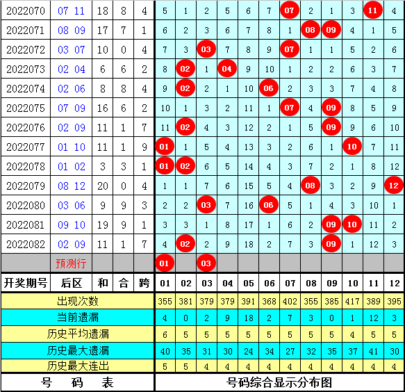 石浩第2022083期大乐透后区分析:后区上周星期六后区奖号为03和06,上期开出奖号02和09,最近9周星期六与最近9期后区奖号奇偶比分别为10:8和8:10,大小比都为9:9,本期预计后区开出全小组合。注意号码01、03、04、06。