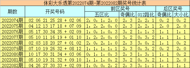 体彩大乐透第2022082期奖号为04 26 27 30 33 + 02 09,前区号码五区比为1:0:0:2:2,奇偶比为2:3,012路比为3:1:1,后区号码奇偶比为1:1,大小比为1:1。