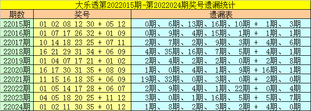 上期回顾:大乐透第2022024期开出奖号:01 02 11 30 35 + 01 12,前区号码奇偶比为3:2,大小比为2:3,和值为79,跨度为34。后区和值为13,跨度为11。