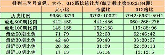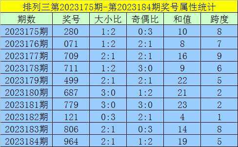 上期回顾:排列三第2023184期出现奖号964。开出组六,奇偶比1:2,012路比2:1:0,大小比2:1,和值19,跨度5。