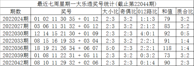 上期回顾:大乐透第2022045期开出奖号:02 03 07 12 20 + 01 05,前区号码奇偶比为2:3,大小比为1:4,和值为44,跨度为18。后区和值为6,跨度为4。