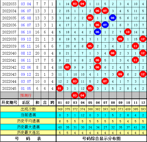 后区上期两码开出01和05,其号码遗漏值为12期+5期,本期后区重防冷码解冻,四码参考02、03、04、12,两码关注03和04。