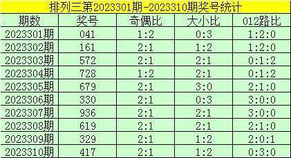 开奖回顾:排列三第2023310期奖号为:417,其奇偶比为2:1,大小比为1:2,奖号012路比为0:3:0。