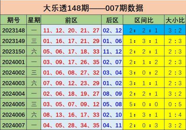 大乐透第2024007期出奖号统计:前区04 05 28 34 35,后区04、11,和值为106,跨度31,龙头04凤尾35,三区比为2:0:3,012路比为0:3:2,奇偶比为2:3,大小比为3:2,冷热比为4:1,0枚重号,2组连号。后区开出遗漏28期的小偶数04、遗漏27期的大奇数11。