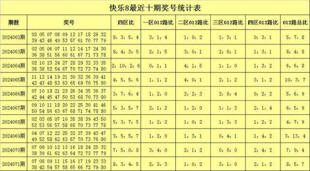 福彩快乐8第2024071期开奖回顾:07 08 09 11 15 16 17 19 23 33 38 42 54 57 58 65 66 72 79 80,其中奖号四区比为8:3:4:5,012路比为8:5:7,和值为769,跨度为73。