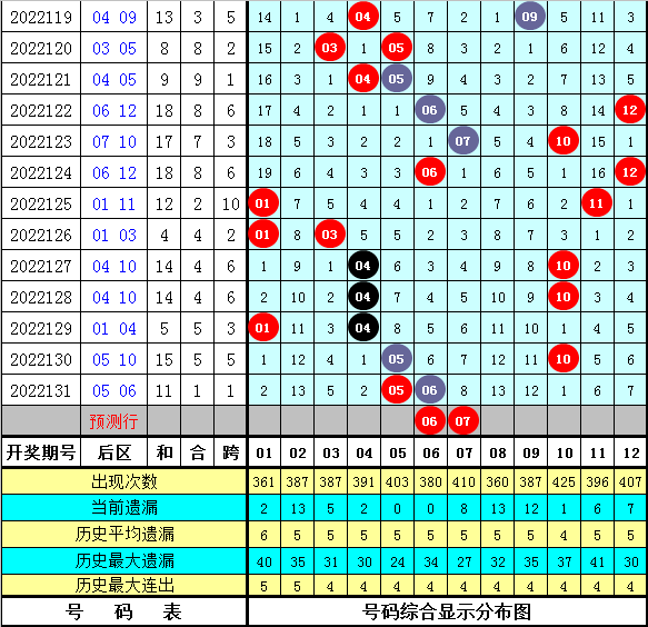 5、后区分析:上期后区奖号为:05和06,开出小小组合和奇偶组合,本期看好大小号持平,预计奇偶号平衡,两码看好07、06。