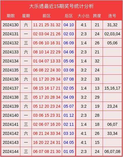 上期回顾:大乐透2024144期开出奖号:前区06、07、08、21、30,后区01、05。