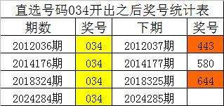 从上表统计可以看出,直选号码034开出之后,其下期奖号: