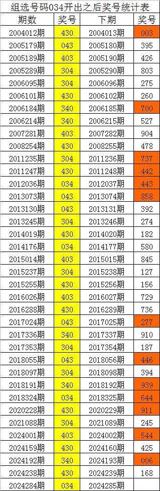 体彩排列三组选号码034历史上出现了37次,其下期奖号分别为:003、395、426、803、275、260、700、527、904、478、737、442、443、858、392、274、182、580、845、127、156、729、736、277、910、187、446、394、939、644、911、245、544、425、006、168,详细统计见下表:
