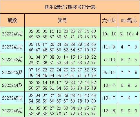 快乐8第2023246期奖号为:01 02 05 27 29 33 34 40 45 47 53 56 58 62 70 71 72 73 75 77,其中奖号012路比为5:6:9,大小比为12:8。
