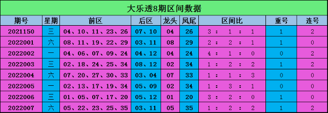 许老六大乐透第2022008期前区四区划分分析(定义:01-09段为一区,10-18段为二区,19-27段为三区,28-35段为四区):