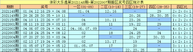 上期回顾:大乐透第2022007期开奖号码为:05 22 23 25 35+03 11,其中前区奖号四区比为1:0:3:1。