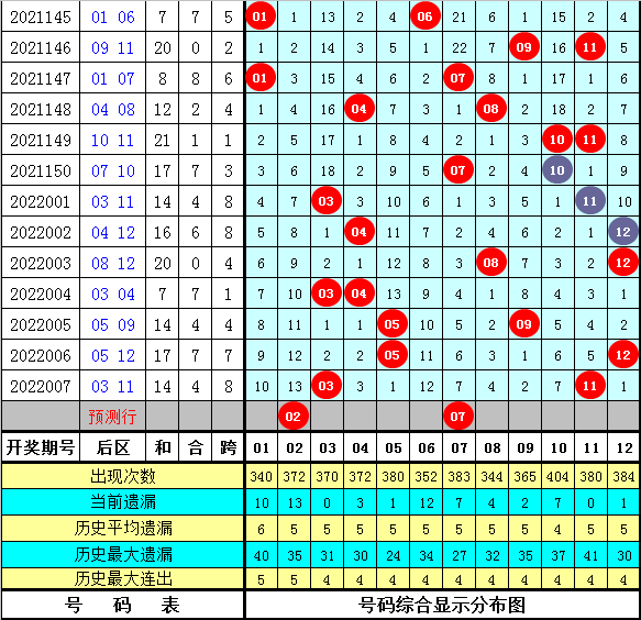 后区号码分析:后区上期开出奖号03和11,历史上前5次号码03与11同时出现之后,其下期分别开出奖号:06+10、04+09、05+06、06+08、04+12,本期后区注意号码02、03、04、07、12,精选两码02、07。