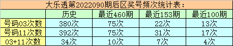 万妙仙大乐透第2022090期前区热号分析:(统计最近460期数据)
