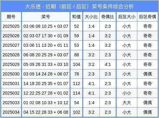大乐透第2025034期开奖号码:前区04、15、22、28、33;后区06、08。前区号码大小比为3:2,奇偶比为3:2,后区开出偶偶、小大组合。