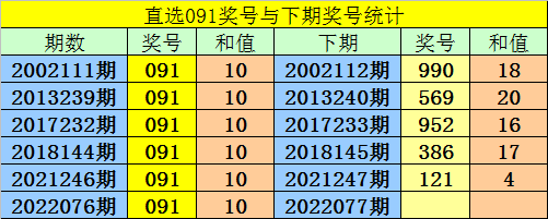 第2022076期3D奖号为:091,历史上该号码直选开出6次,下期号码分别为:990、569、952、386、121。