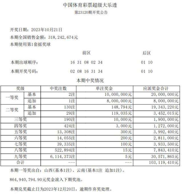 北京时间10月21日晚,体彩大乐透第23120期开奖,当期开奖号码为:前区02 08 16 31 34,后区01 10。
