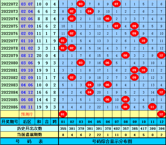 后区分析:上期后区开出全大组合:08+11,最近10期后区奖号大小比为10:10,本期后区注意一大一小组合回补,关注两码01、12。