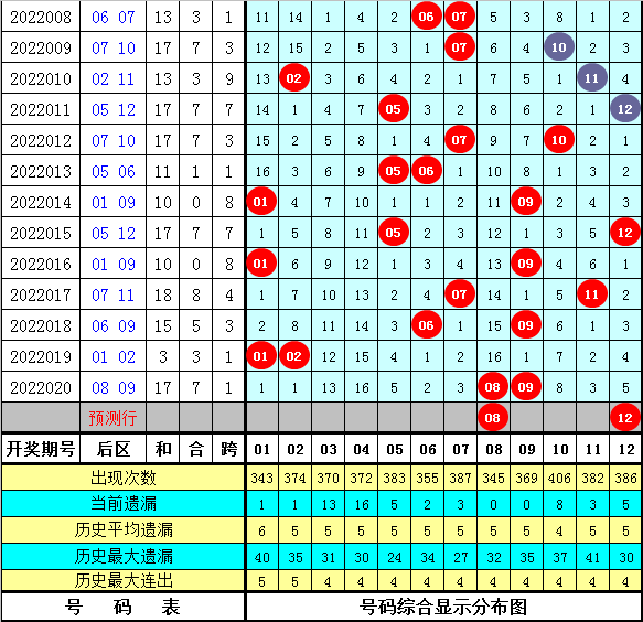 5。后区上期开出号码:08+09,为一奇一偶组合。最近20期后区奇偶比为24:16,奇数号码明显热出,其中一奇一偶组合出现12次,全奇组合出现6次,全偶组合出现2次。本期看好出现全偶组合,关注两码08+12。