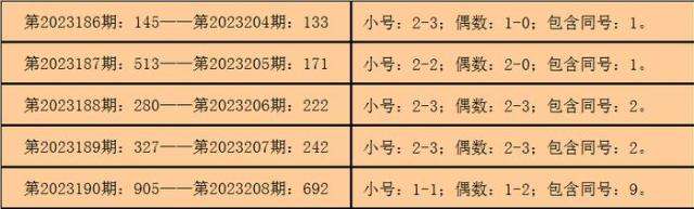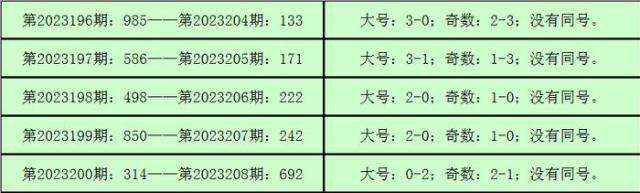 则,3D第2023201期开出奖号:172,其大小比为1:2,奇偶比为2:1,012路比为0:2:1,与3D第2023209期奖号可能没有同号。