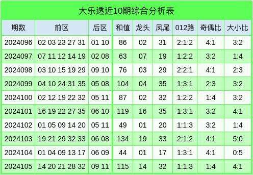 大小比分析:上期后区开出奖号的大小比为4:1,其中大数较热,在最近10期开奖中,前区大小个数比为26:24。本期需要关注小数出号,大小比关注2:3。