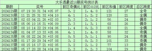 大乐透第2024138期开奖,前区:05、17、20、28、34;后区:04、09。其中前区和值为104,跨度为29,012路比为0:2:3,奇偶比为2:3,后区开出一偶一奇、1路+0路组合。
