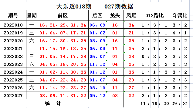 上期回顾:大乐透第2022027期奖号为:03 06 11 31 32 + 05 12,各位号码遗漏期数分别为:14期、24期、0期、6期、10期+11期、2期,前区遗漏总值为54期,后区遗漏总值为13期。