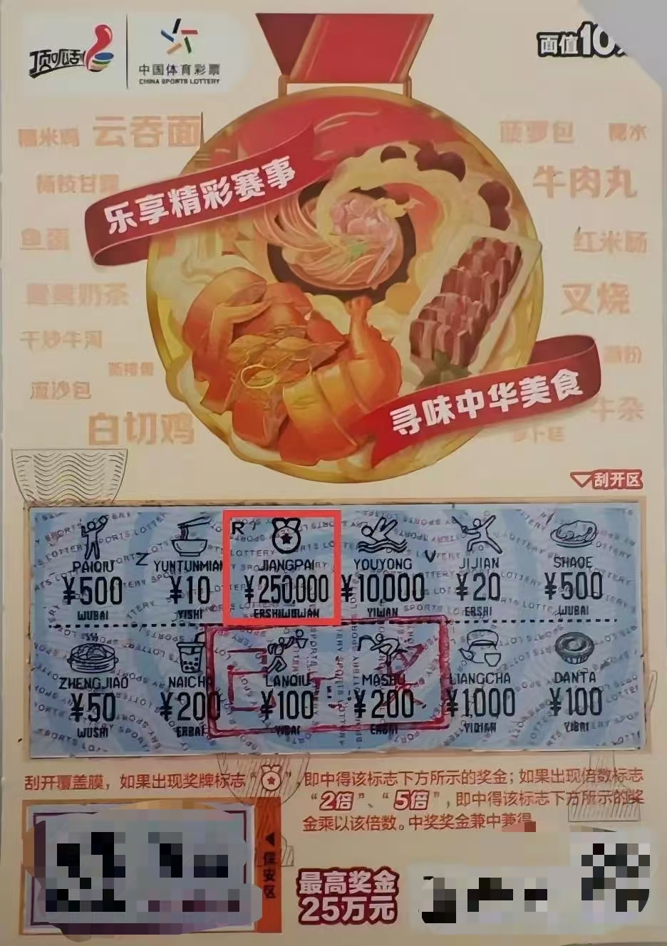 这款面值10元的创意即开票将体育竞技与中华美食完美结合:票面左侧是奋力拼搏的运动健儿,右侧则是飘香四溢的地方美食。玩法简单上手,只需刮出奖牌标志即中奖,若遇倍数标志奖金还能翻倍,新颖的设计让购彩体验妙趣横生。