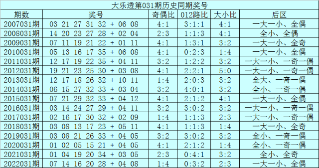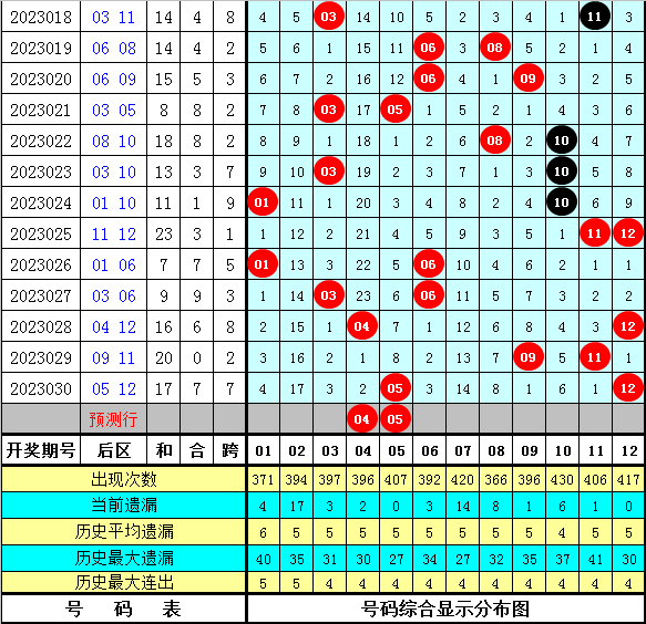 后区第二位分析:在历史第031期同期奖号中,后区第二位号码全部在04-12区段出现,其中该位号码奇偶比为9:7,大小比为11:5,012路比为2:2:12,本期第二位号码关注05。