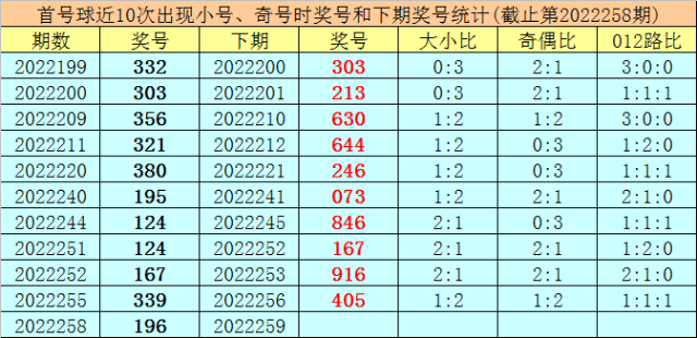 在首号球前10次开出小号、奇号类型之后,其下期分别开出奖号:303、213、630、644、246、073、846、167、916、405,其中号码大小比为4:6,012路比为5:2:3,奇偶比为3:7。