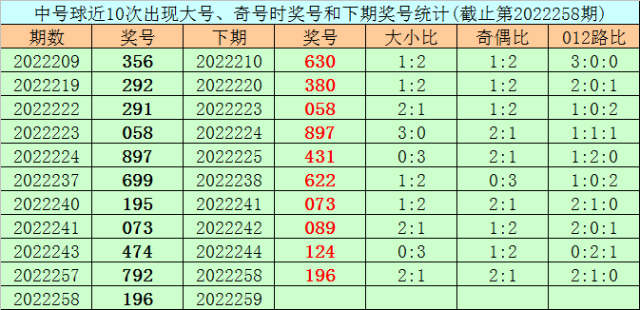 在中号球前10次开出大号、奇号类型之后,其下期分别开出奖号:630、380、058、897、431、622、073、089、124、196,其中号码奇偶比为6:4,大小比为6:4,012路比为4:1:5。