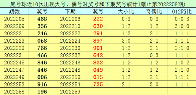 在尾号球前10次开出大号、偶号类型之后,其下期分别开出奖号:222、630、291、897、901、642、832、049、015、735,其中号码奇偶比为6:4,大小比为4:6,012路比为2:3:5。