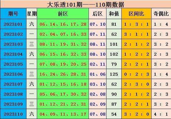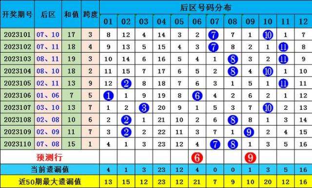 上期后区开出1、2路号码组合:07 08,最近10期后区奖号012路比为3:7:10,0、1路出号频次较低;本期后区奖号继续关注0路和0路,后区参考:06 09。