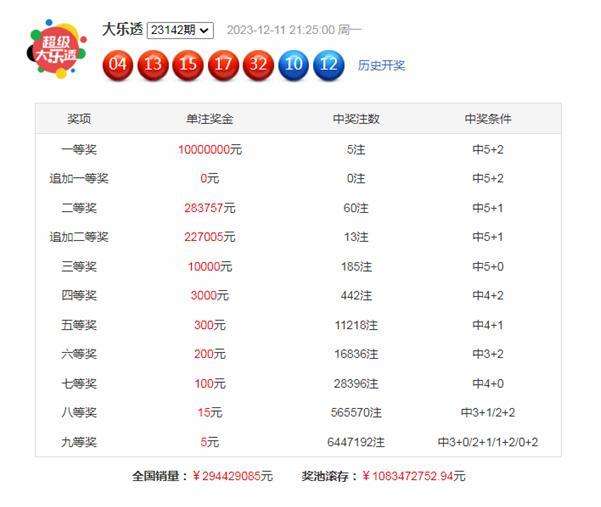 体彩大乐透第2023142期开出奖号:04、13、15、17、32+10、12。其中前区奖号012路比为1:2:2,奇偶比为3:2,后区开出1路号码和0路号码。