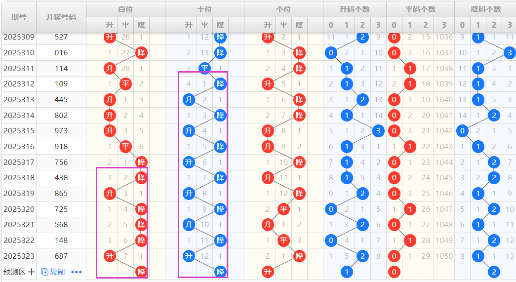 【排列3个位】:近十期升降走势为:降-平-升-平-降,为一种单一加重复性的交错走势,结合走势图可以看出,图中紫色框圈出为一种M形态的出球方式,本期可以重点看好升的形态号码的开出。