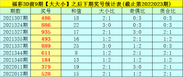 一、上期回顾:福彩3D第2022023期奖号为:874,奖号类型开出组六,大小比为2:1,奇偶比为1:2,和值为19,跨度为4,012路比为0:2:1。