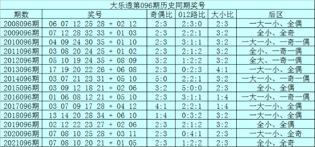 后区第二位分析:在历史第096期同期奖号中,后区第二位号码全部在02-12区段出现,其中该位号码大小比为9:5,012路比为6:4:4,奇偶比为4:10,本期第二位号码关注08。