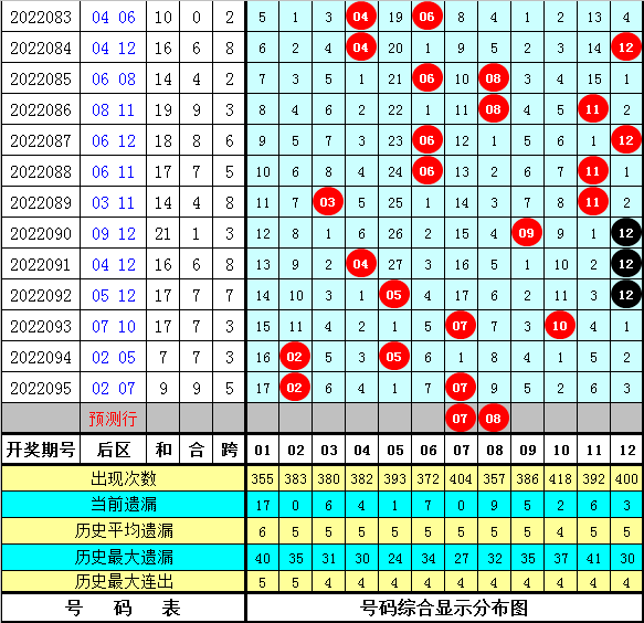 后区第一位分析:在历史第096期同期奖号中,后区第一位号码全部在01-08区段出现,其中该位号码大小比为1:13,012路比为3:5:6,奇偶比为7:7,本期第一位号码参考07。