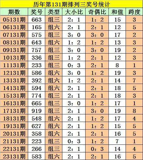 排列三第2023131期奖号:583,和值16,跨度5,大小比2:1,奇偶比2:1。