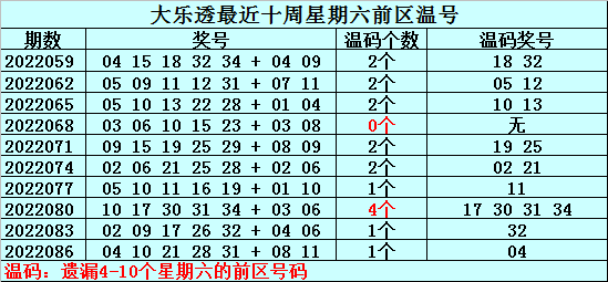 温号:最近十周星期六前区开出17个温号,上周星期六前区开出1个温号,本周星期六关注温号23。