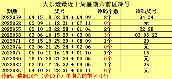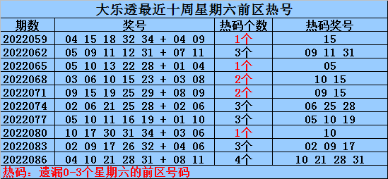 热号:最近十周星期六前区开出23个热号,上周星期六前区开出4个热号,本周星期六注意热号11。