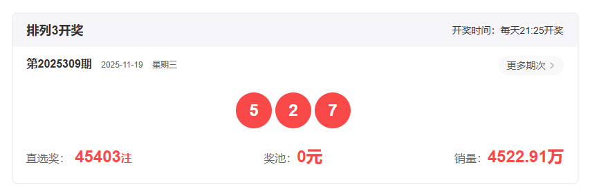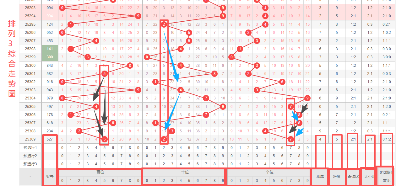 体彩排列3第2025309开奖号码527,形态为组六,奇偶比2:1,和值14,跨度5,大小比2:1,【012】路个数比0:1:2。