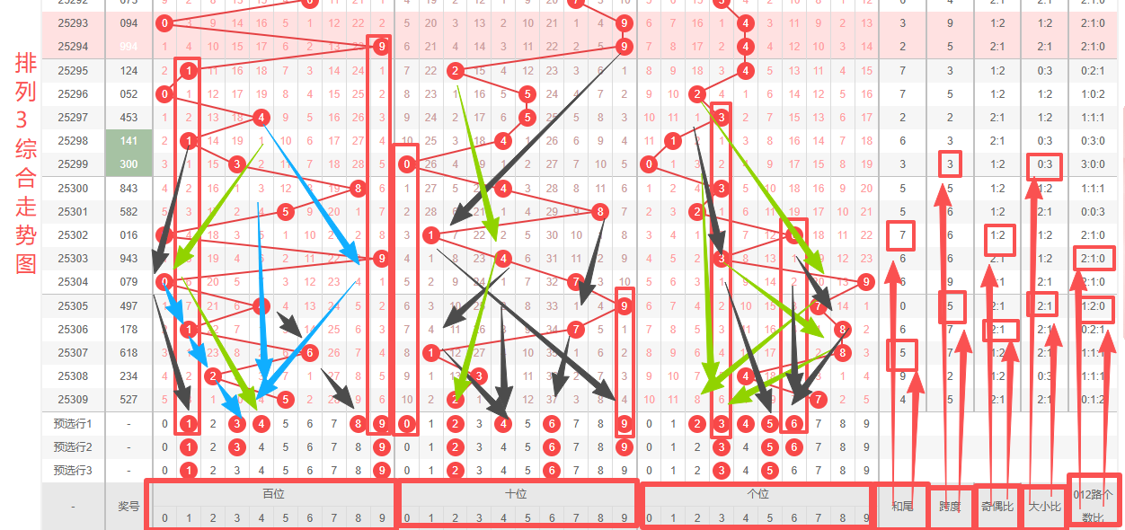 第2025301期数据分析中形态、大小比、和值,5*5*5五码、3*3*3三码复式直选,中五码、六码、七码组选,中四注直溜溜。