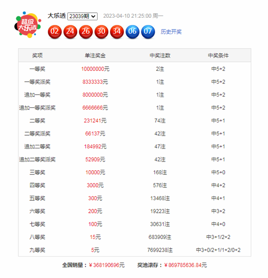 大乐透第2023039期开出奖号:前区02、24、26、30、34,后区06、07。当期前区012路比为2:1:2,奇偶比为0:5,和值为116,跨度为32,后区奖号全在二区。