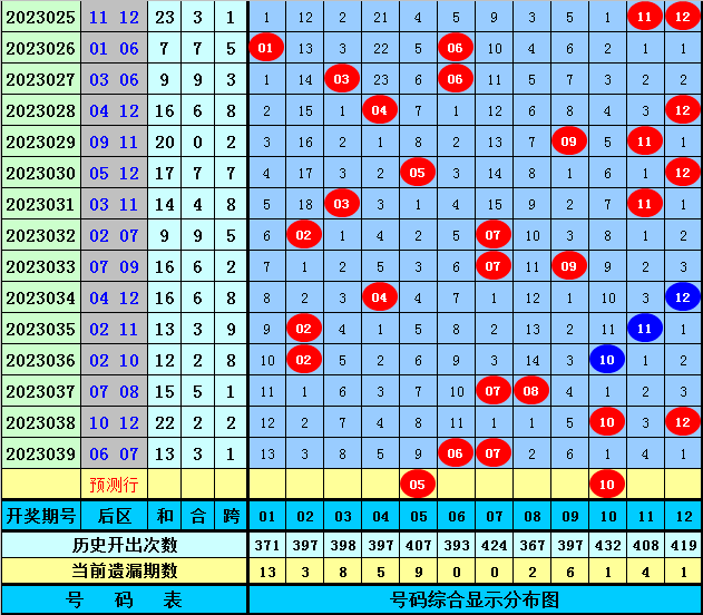 后区分析(定义:01-04为一区,05-08为二区,09-12为三区):上期后区开出奖号06和07,全在第二区出现,最近10期后区三个区间落号个数比为5:7:8,本期后区注意第二区和第三区号码出现,关注两码05、10。