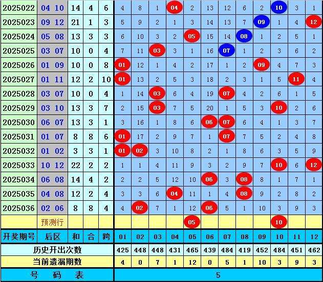 后区分析【一区01-04,二区05-08,三区09-12】:上期后区奖号为02和06,分别落在第一、二区,近50期后区三区比为37:31:32,近10期三区比为8:8:4,本期注意第二、三区号码出现,关注两码05+10。