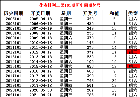 2022年4月21日排列三第101期开奖,历史同期分别开出奖号: