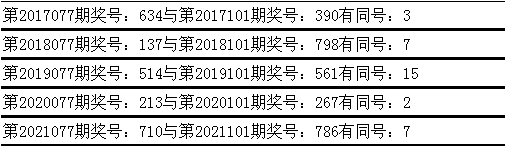 与前期历史同期奖号对比分析,在最近五年开奖中,第077期同期奖号与第101期同期奖号都出现了相同号码: