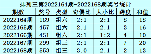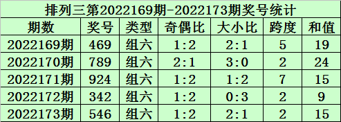 上期回顾:排列三第2022173期开奖号码为546。奖号类型为组六,奇偶比为1:2,大小比为2:1,跨度为2,和值为15。